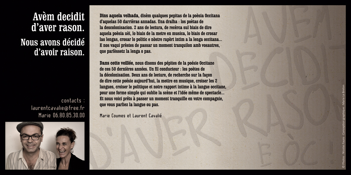 La première sera poétique & occitane avec le duo Marie Coumes / Laurent Cavalié autour de leur spectacle “Avèm decidit d’aver rason / Nous avons décidé d’avoir raison”.