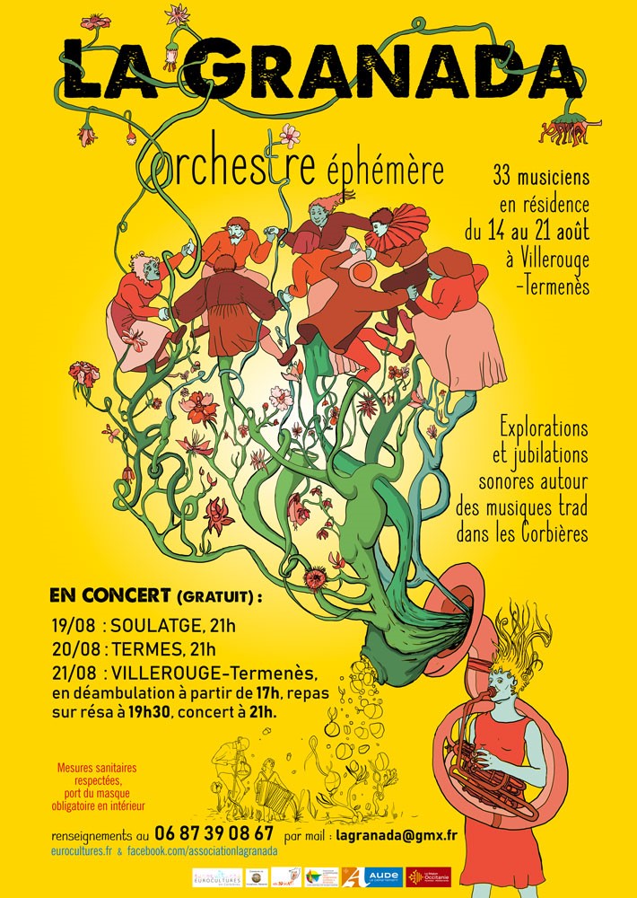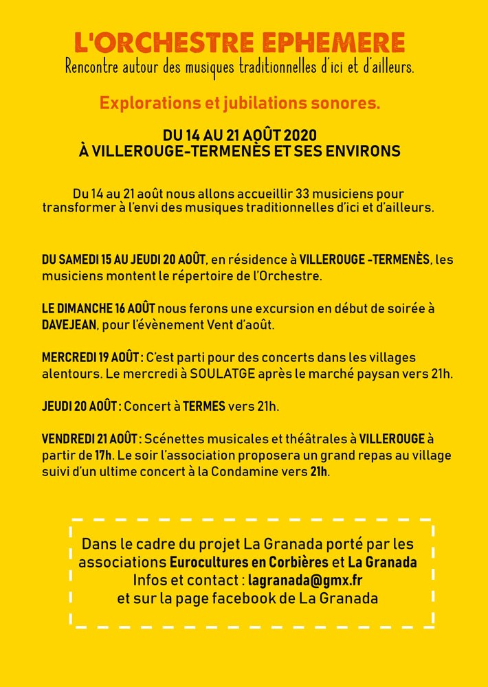 Vous pourrez venir les écouter : le dimanche 16 août à Davejean, le mercredi 19 août à partir de 21h à la fin du marché de Soulatge, le jeudi 20 août à Termes à 21h et enfin pour clôturer cette folle semaine le vendredi 21 août à Villerouge-Termenès : dès 17h dans tous les recoins du village et à 21h à la Condamine pour un ultime concert.